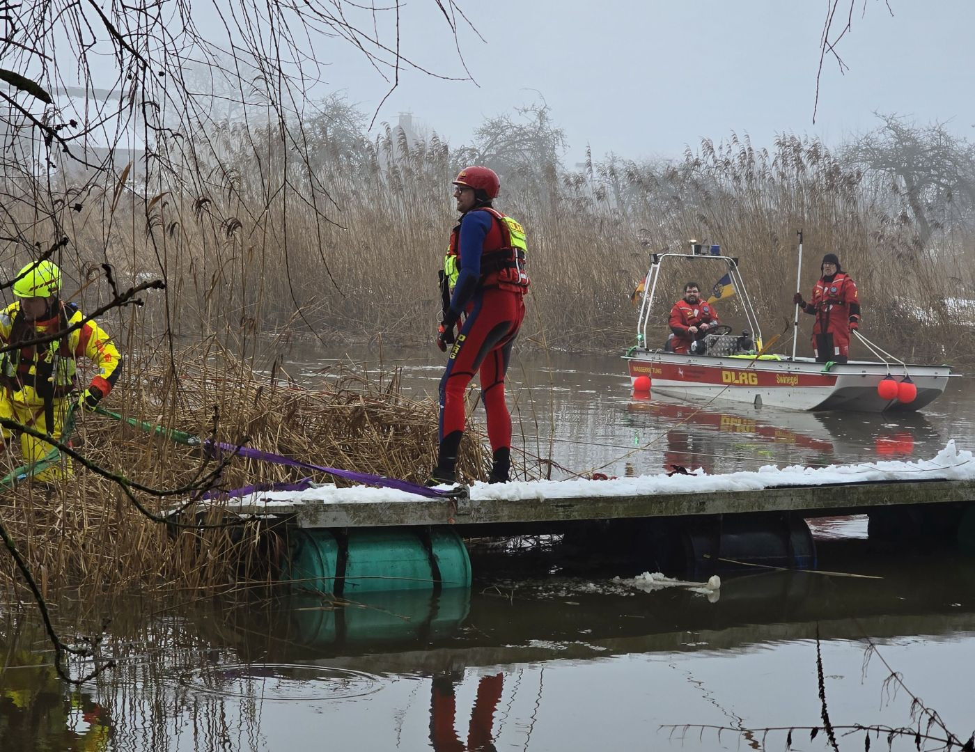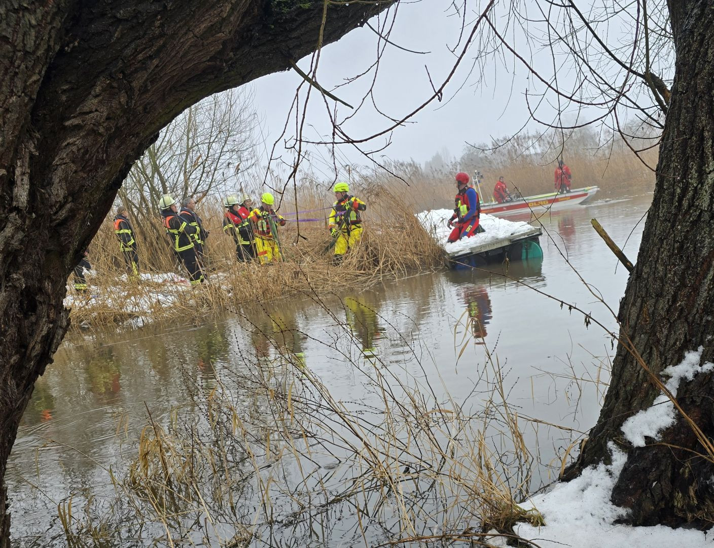 Mit den beiden eingesetzten Rettungsbooten der Feuerwehr Estebrügge und der DLRG Buxtehude konnte der Schlengel schließlich gesichtert und in einen Auslauf eines Schöpfwerks zwischen Estebrügge und Buxtehude geschleppt werden.