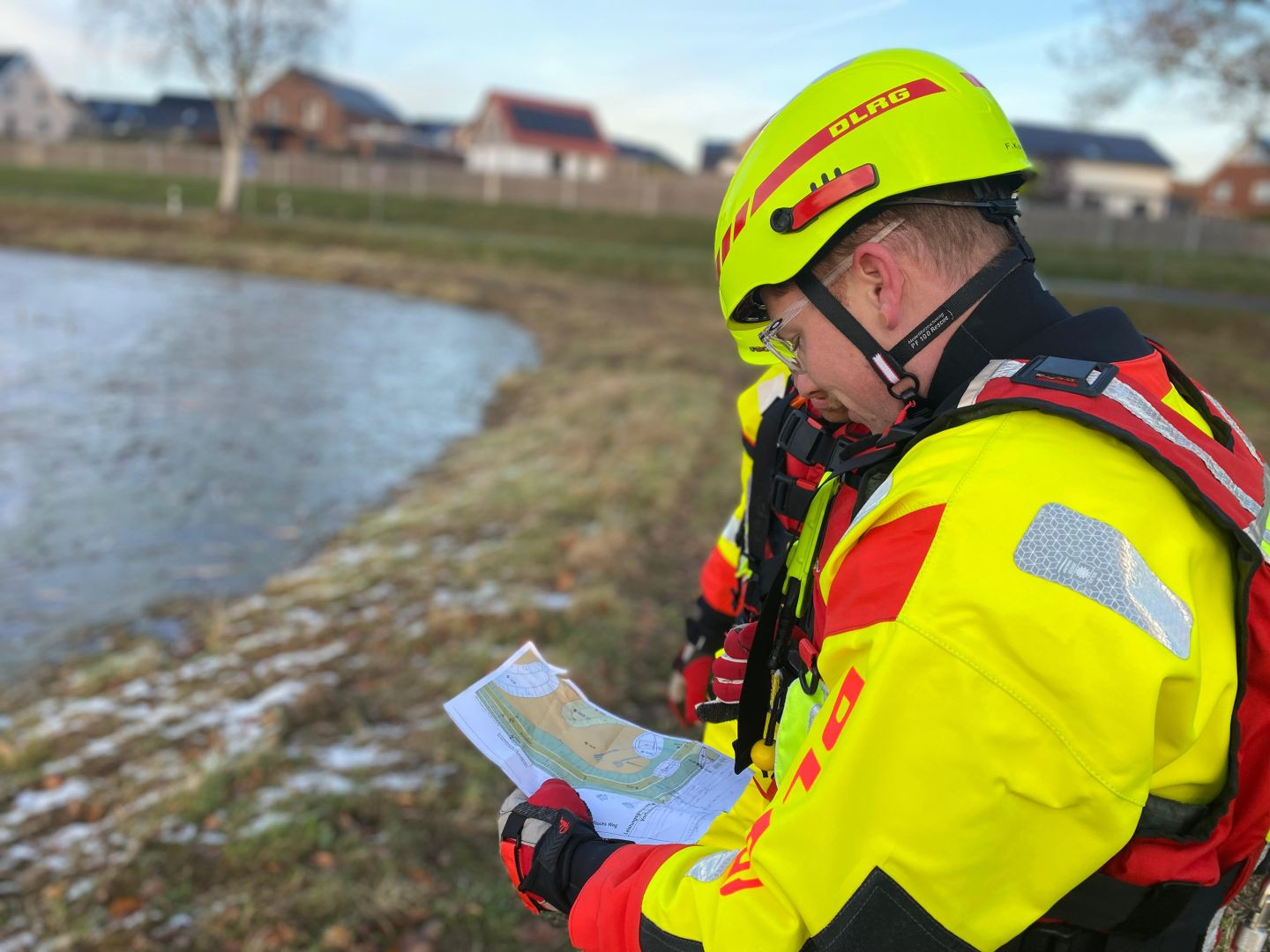 Bei eisigen Temperaturen machten wir uns auf die Suche nach der Ursache. Das Abflussgitter lag rund 1,5 Meter unter Wasser und war zusätzlich mit Pflanzenresten zugesetzt. Nach der Lokalisierung konnten wir das Gitter sowie den unmittelbaren Bereich darum herum freilegen – und das aufgestaute Wasser begann langsam abzulaufen.