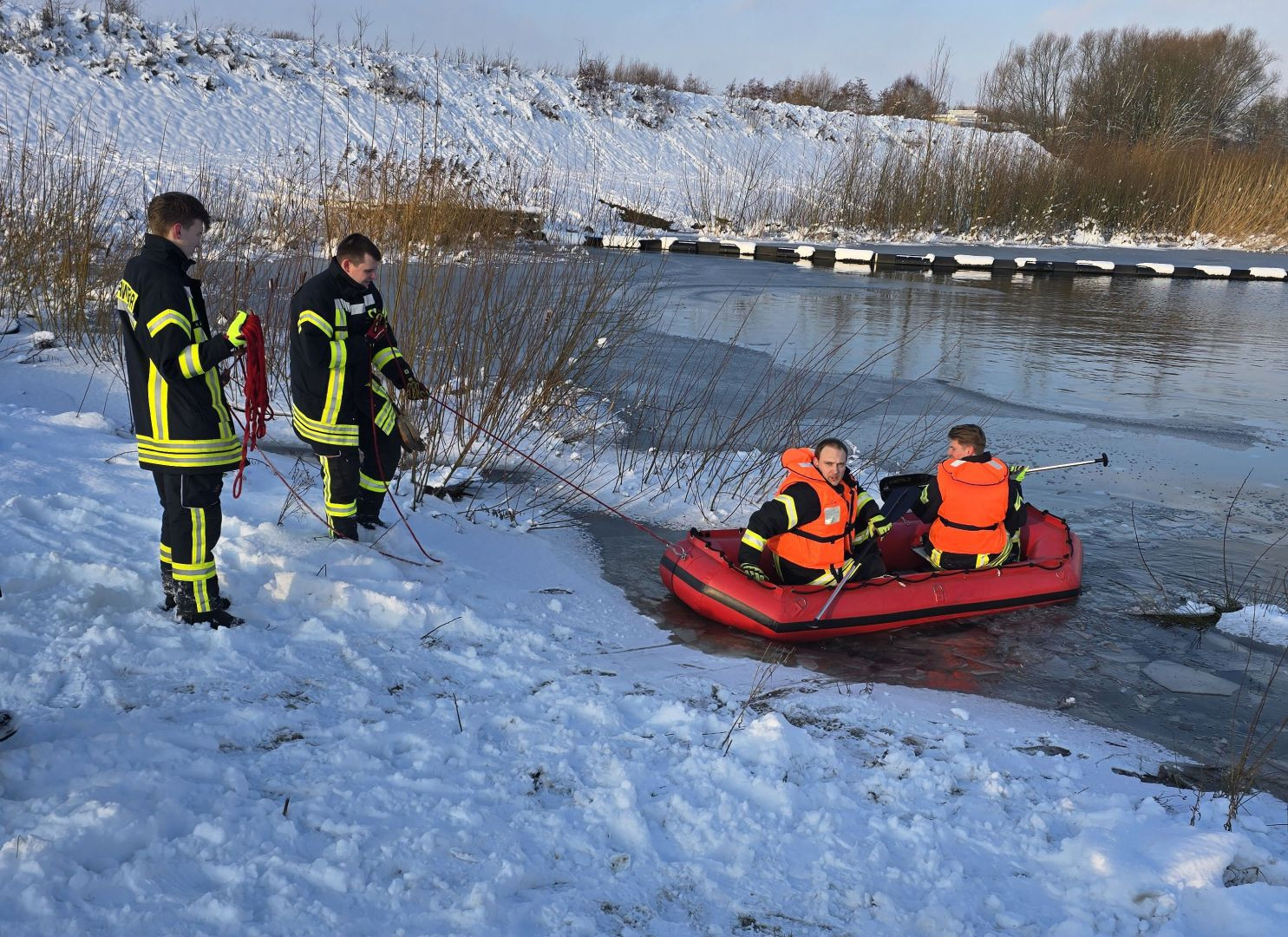 Gemeinsam mit der Feuerwehr Harsefeld wurde in einem Regenrückhaltebecken im Stubbenweg nach einem dort hineingerutschten und versunkenen Hund.gesucht.